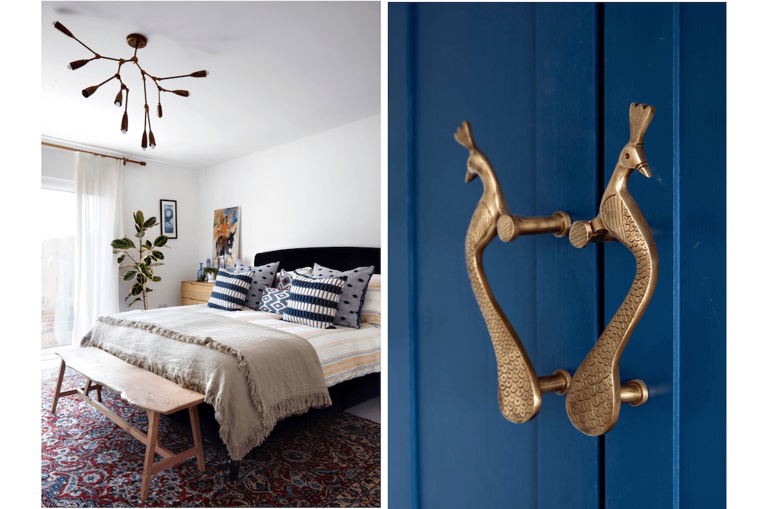 The master bedroom had such a lovely big proportion, so it was important to really fill the room with appropriately proportioned furniture. The vintage Persian rug has wonderful depths of colours and frames the statement blue velvet bed. Chest of drawers are used as the side tables with a dressing table in the same style sitting opposite. A handmade English oak bench was commissioned for the end of the bed to place cushions in the evening. Two large bespoke wardrobes provide ample storage and make a real statement with their brass peacock handles.
